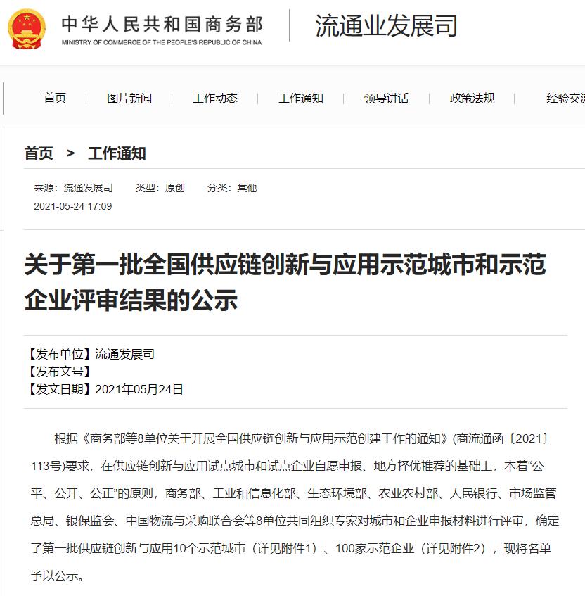 5月24日,商务部网站公示了第一批全国供应链创新与应用示范城市和示范企业评审结果