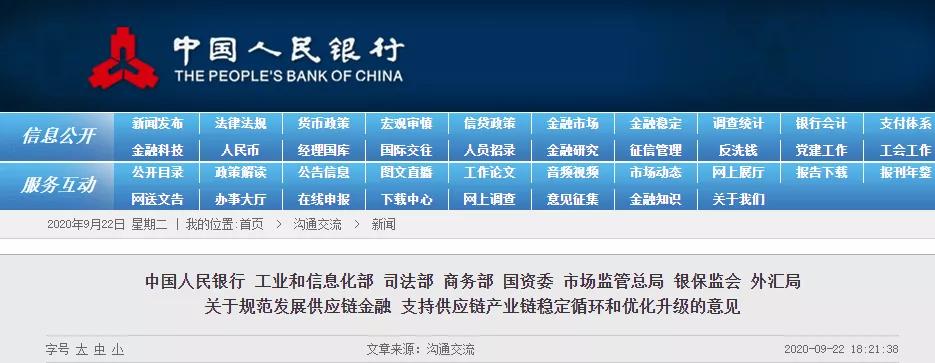 2020年9月22日中国人民银行会同工业和信息化部、司法部、商务部、国资委、市场监管总局、银保监会、外汇局出台了《关于规范发展供应链金融、支持供应链产业链稳定循环和优化升级的意见》(银发〔2020〕226号,以下简称《意见》)